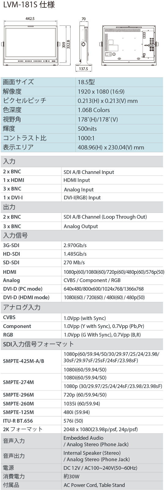 LVM-181S は、HLG、PQ、および PQ2 HDR エミュレーションもサポートしているハイエンドモニター製品です。1920×1080 のネイティブ解像度、最高輝度 500 nit、また強化されたコントラスト比、広視野角を備えた 18.5 インチ IPS LCD パネルを備えた当社の中でもトップグレードな 18.5 インチ モデルであり、他社 LCD モニターの追従を許しません。 再設計されたビデオ処理ユニットにより、強力なデュアルチャネル パフォーマンスとアーティファクトのない画像再生が実現します。 また様々なシネマ カメラのログからリニアへの LUT のサポート、操作性の高いフィールド アップグレード、またモニタリングでの必須である一連の画像処理機能(PBP等多数)が装備されている高品位かつハイスペックなLCDモニターです。