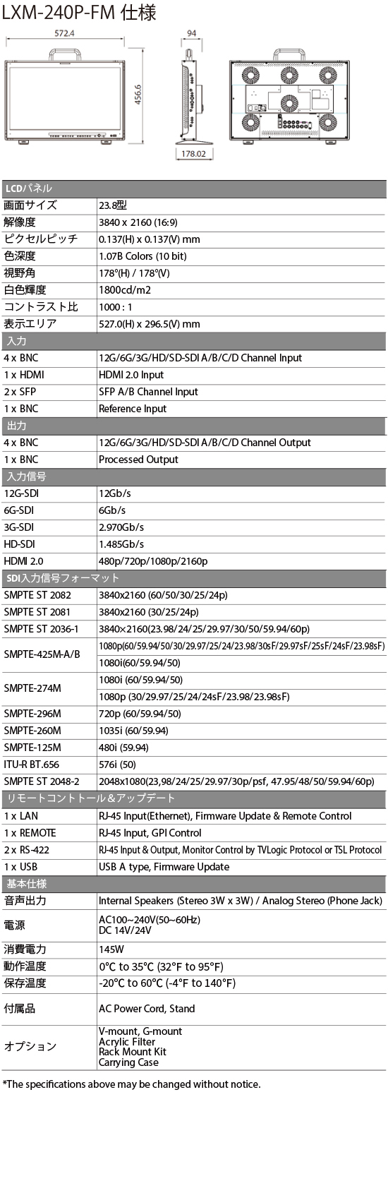 (LXM-180P、LXM-320P:1000nits LXM-240P :1800nits LXM-180U:500nits 16.7Mカラー(8bit)、1920 x 1080)